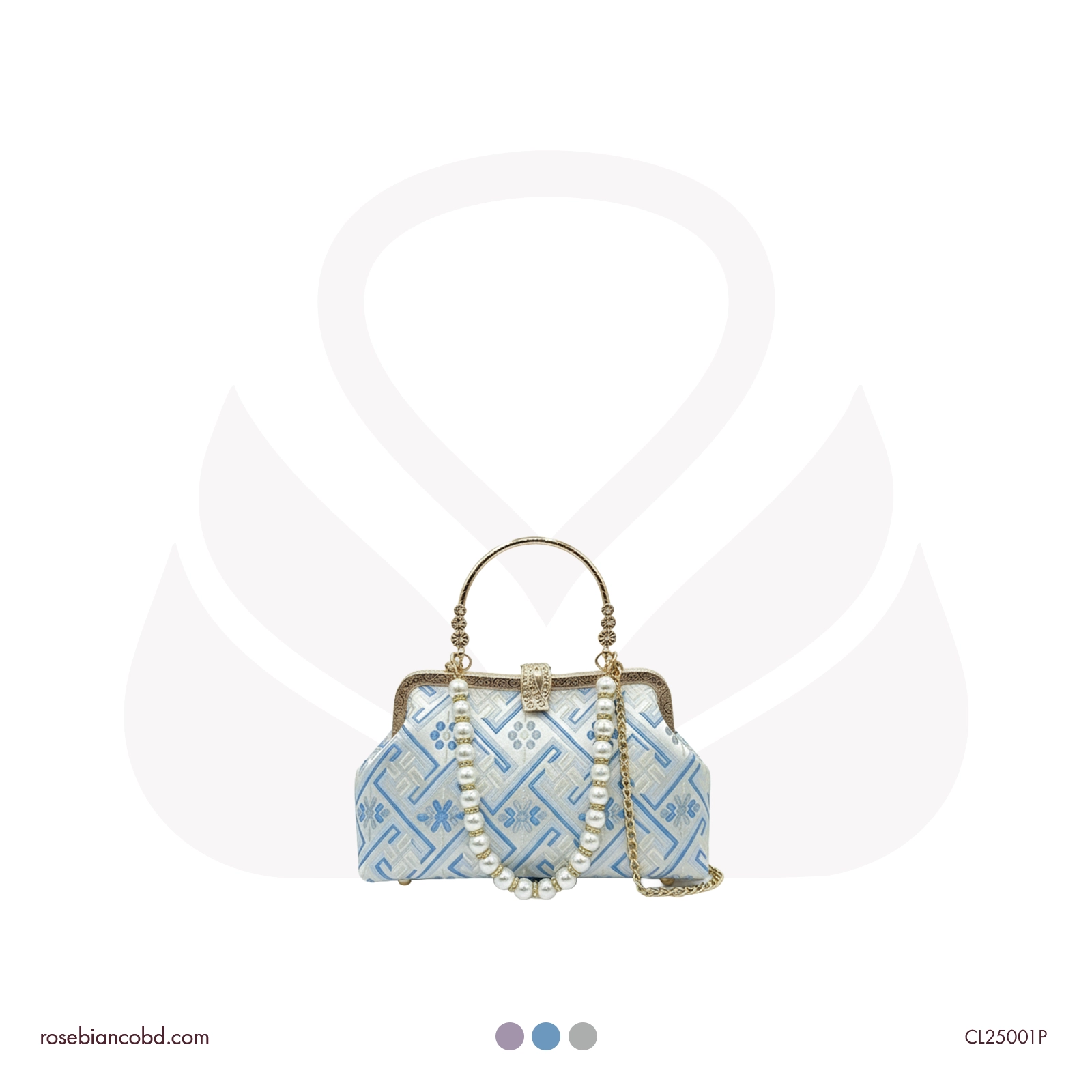 This exquisite fabric dinner bag features intricate embroidery, beading, and chain details for a touch of evening elegance.