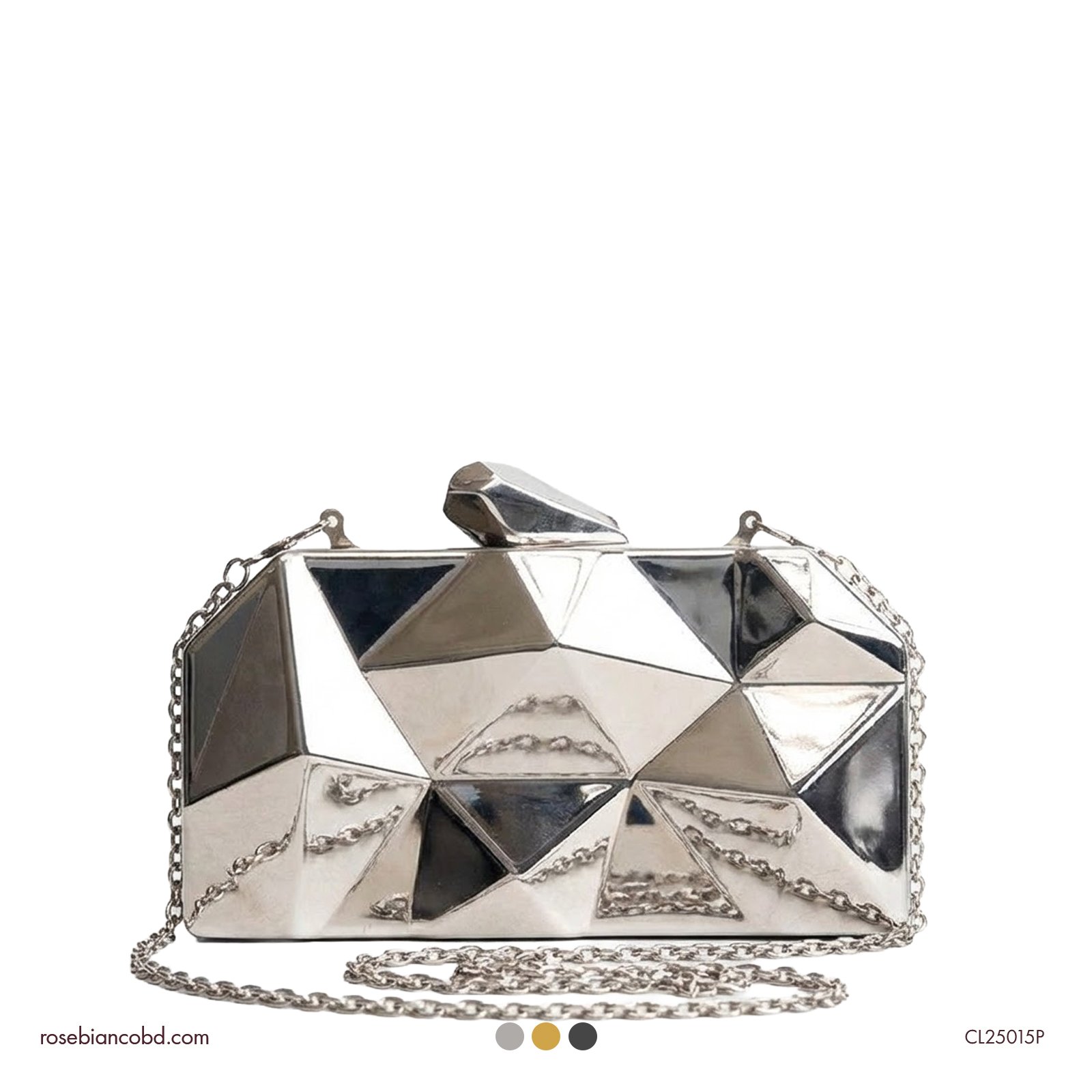 Make a bold, shimmering statement with this Metal Diamond Tin Box Clutch. Inspired by European and American retro fashion, this unique evening bag features a hard-shell metal construction shaped into a striking diamond silhouette. Its distinct “tin box” design offers a structured, architectural look that stands out against traditional soft clutches.
