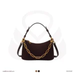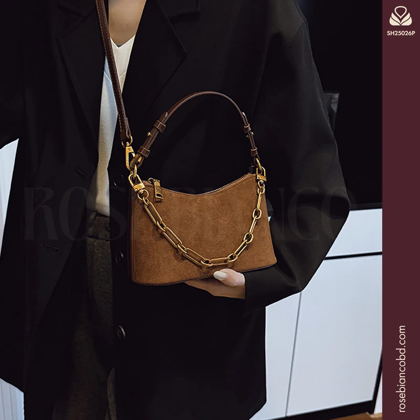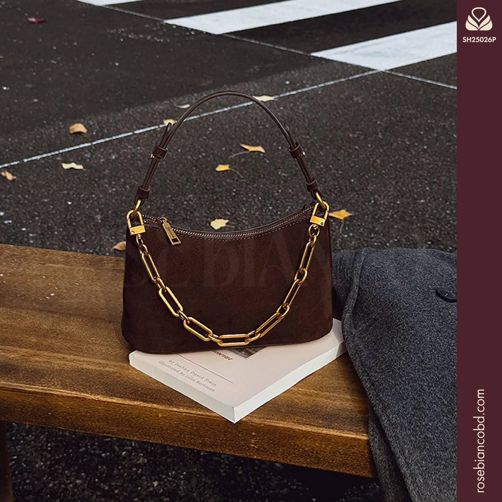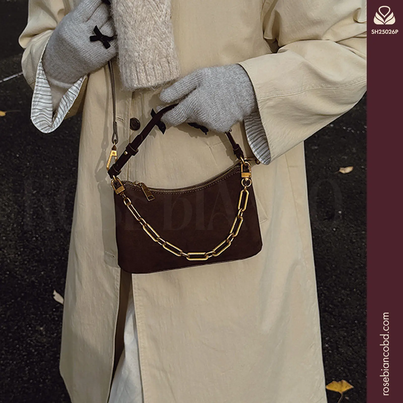 This soft suede handbag combines detailed sewing thread and a chic chain accent, perfect for your retro-inspired everyday look.