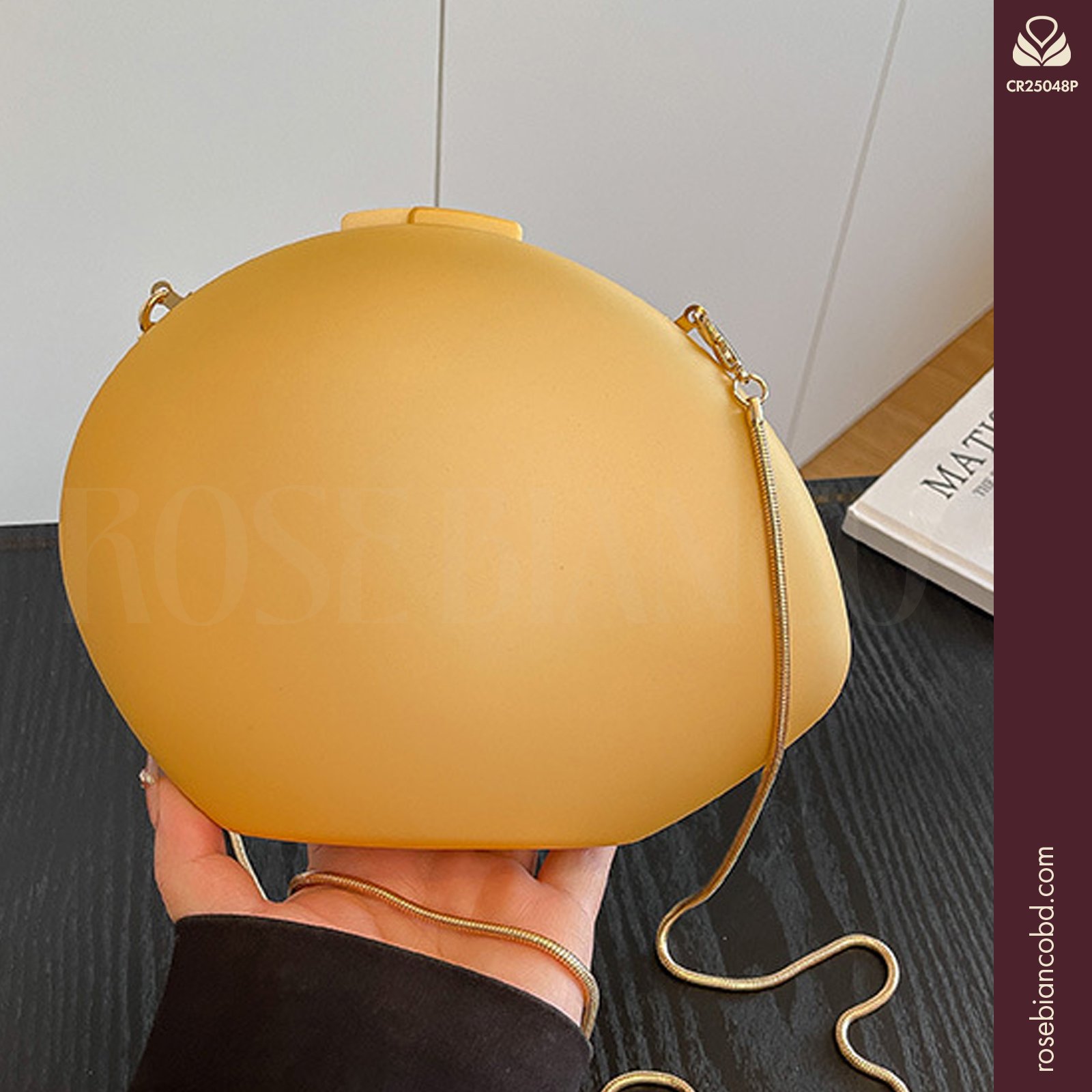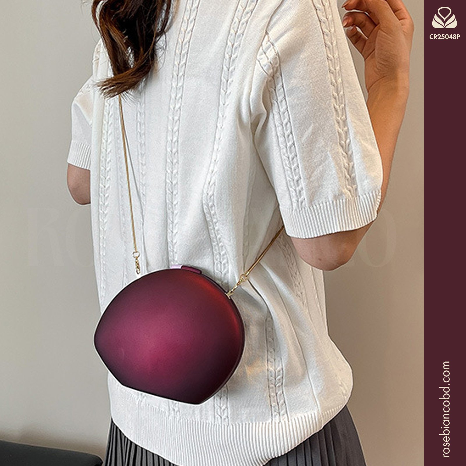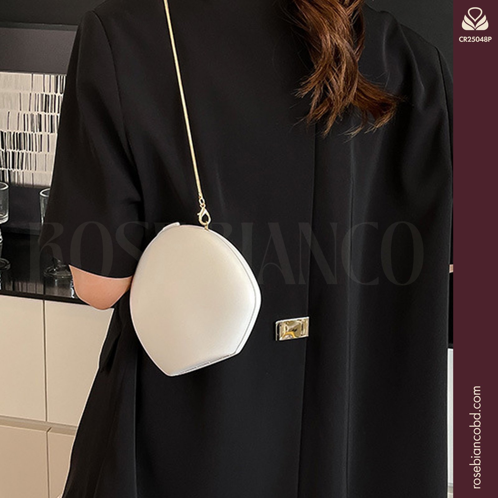 Despite its artistic shape, this bag is designed for utility. The 20cm length and 15cm height offer enough space for a smartphone, lipstick, and keys. It secures with a sleek lock closure, keeping the unlined interior accessible yet safe. While it shines as a handheld clutch, it also includes a stylish chain strap, allowing you to wear it comfortably as a crossbody bag for hands-free convenience.