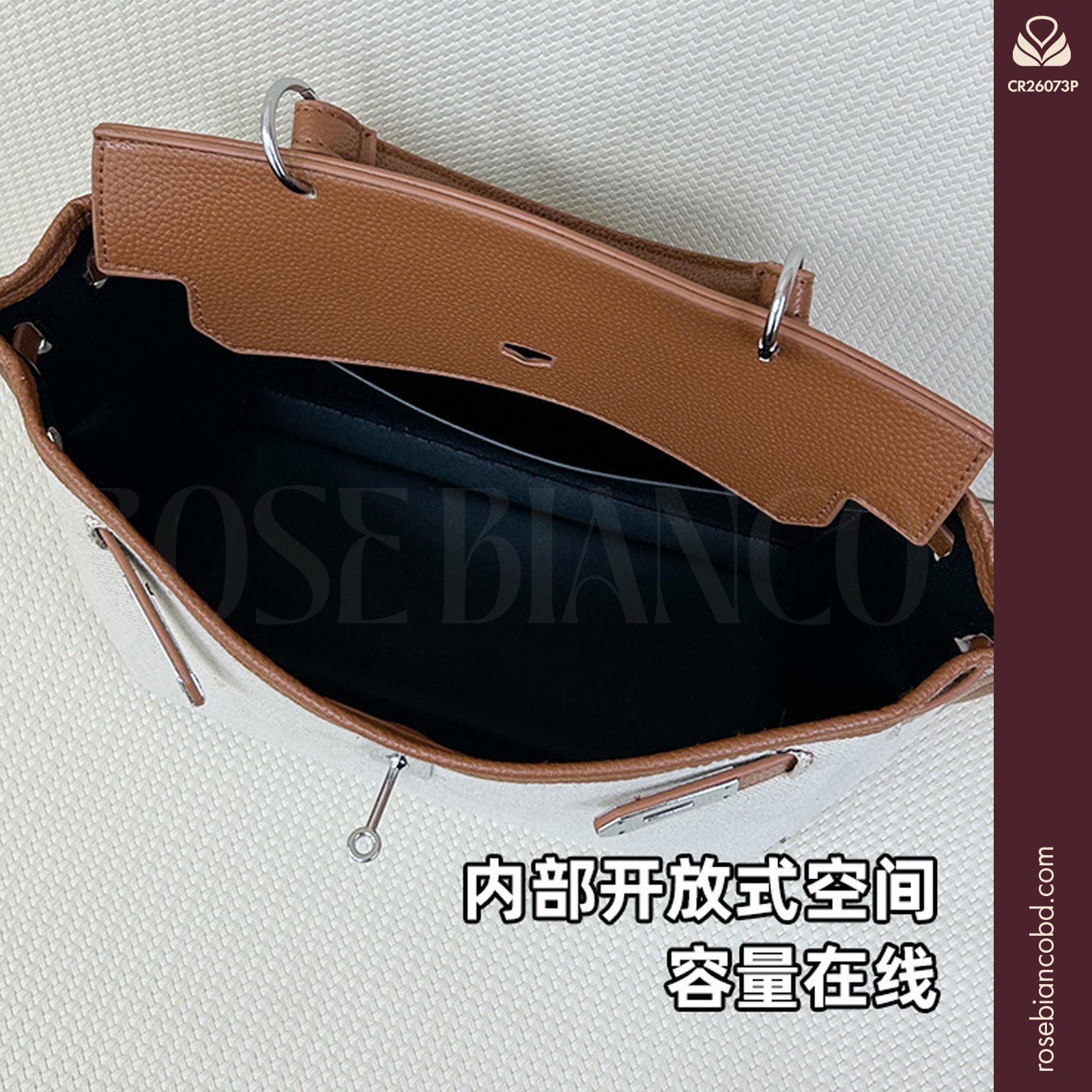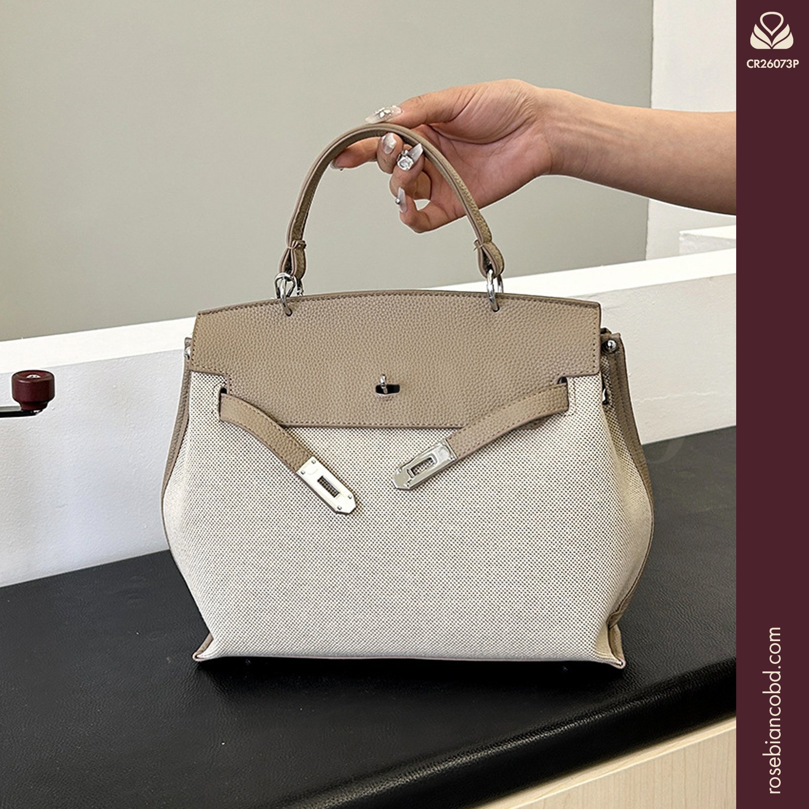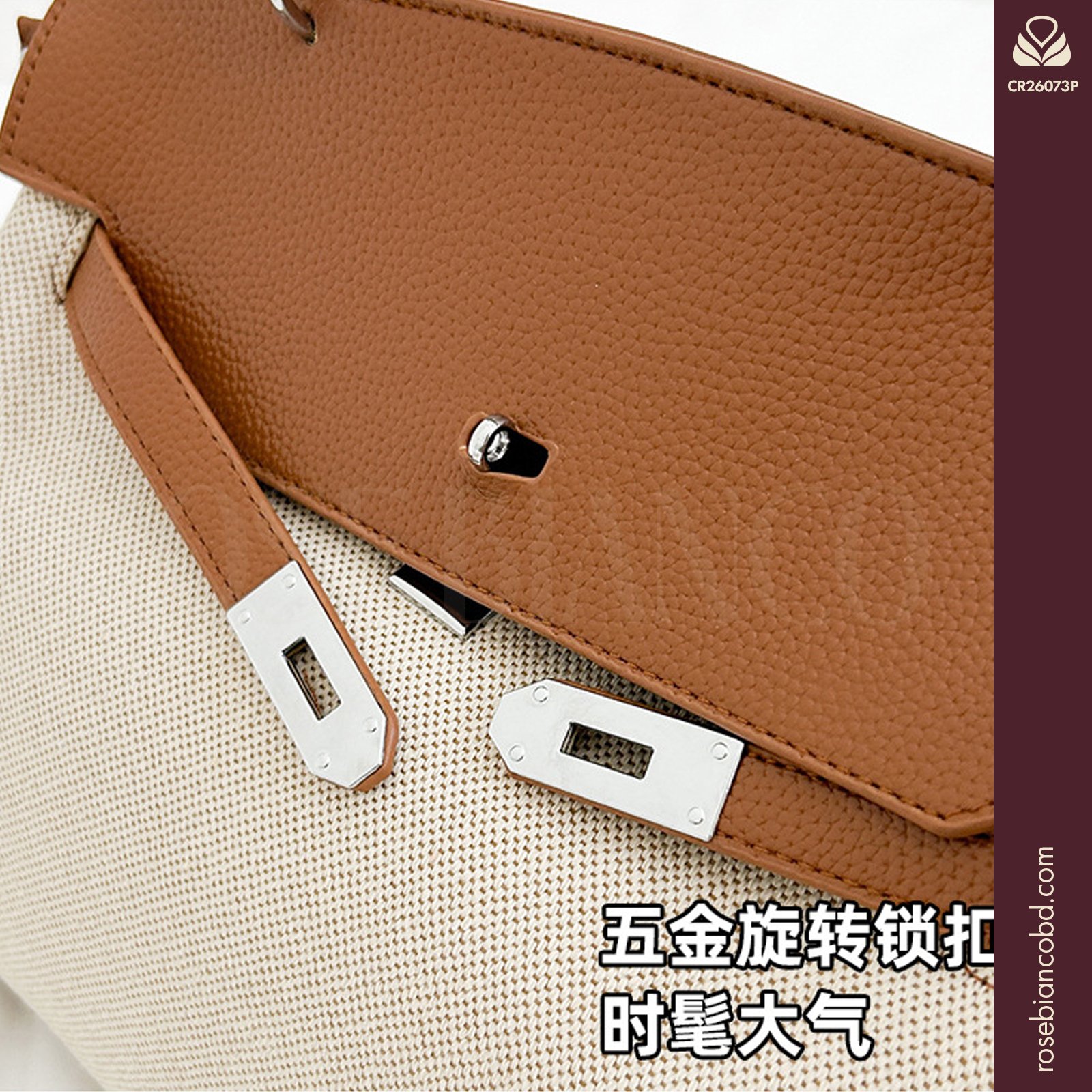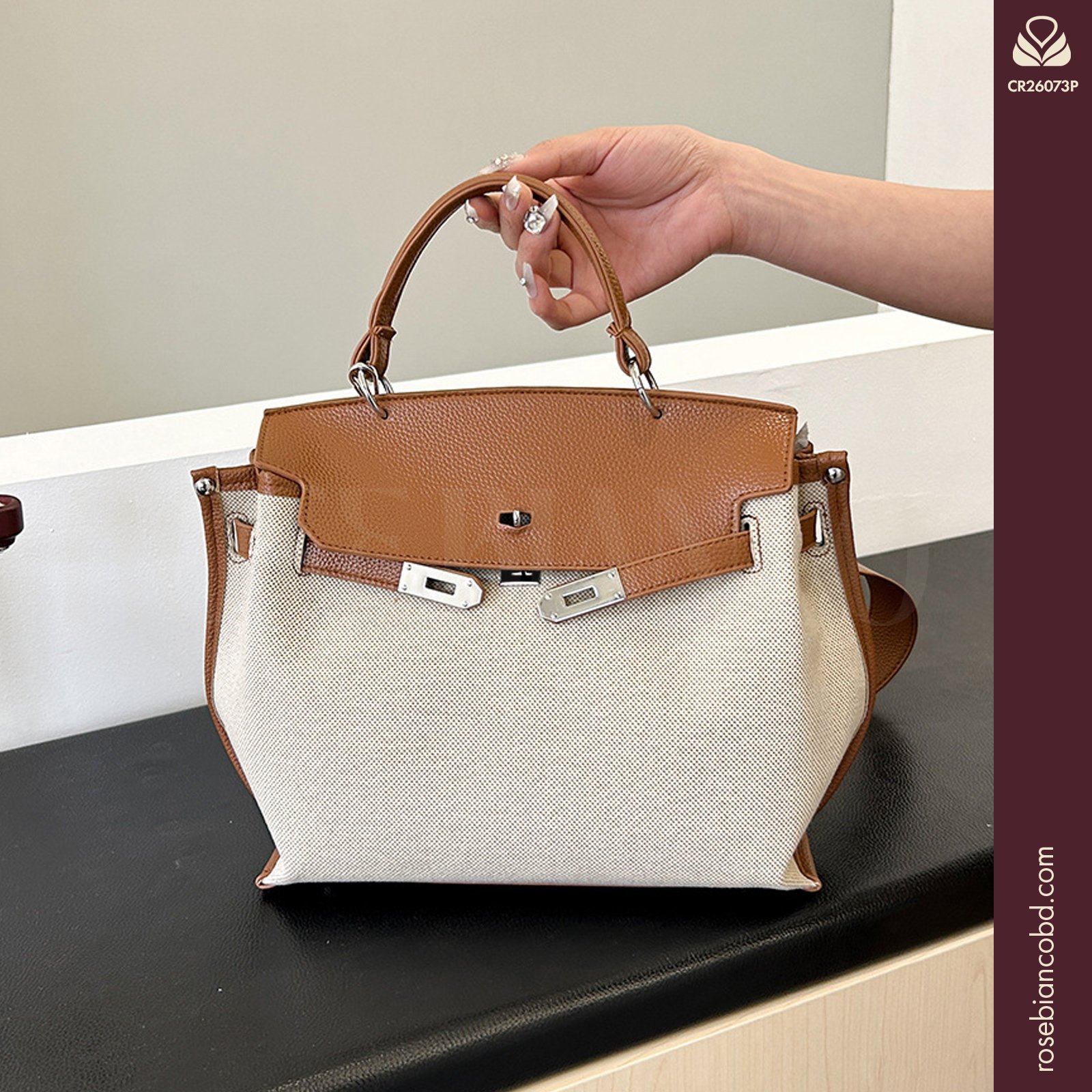 - Design: Horizontal square shape with stylish patchwork and color blocking elements.